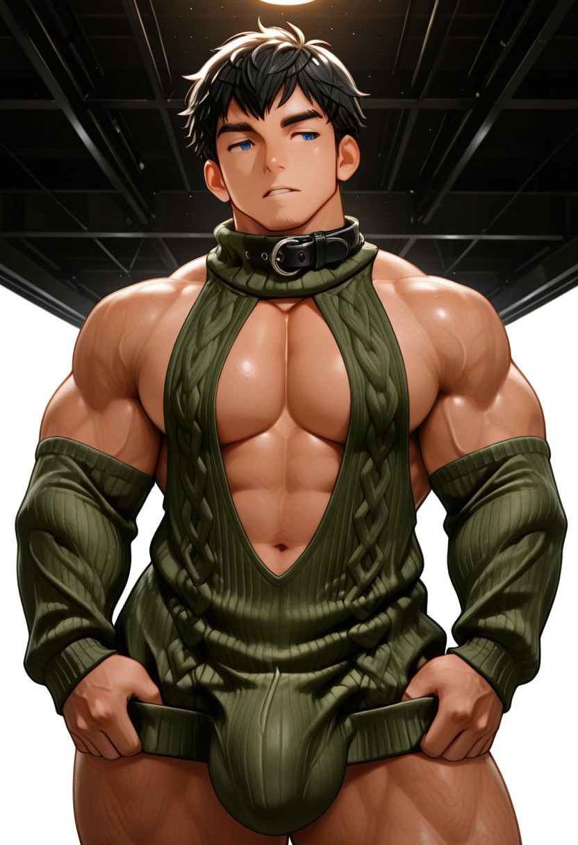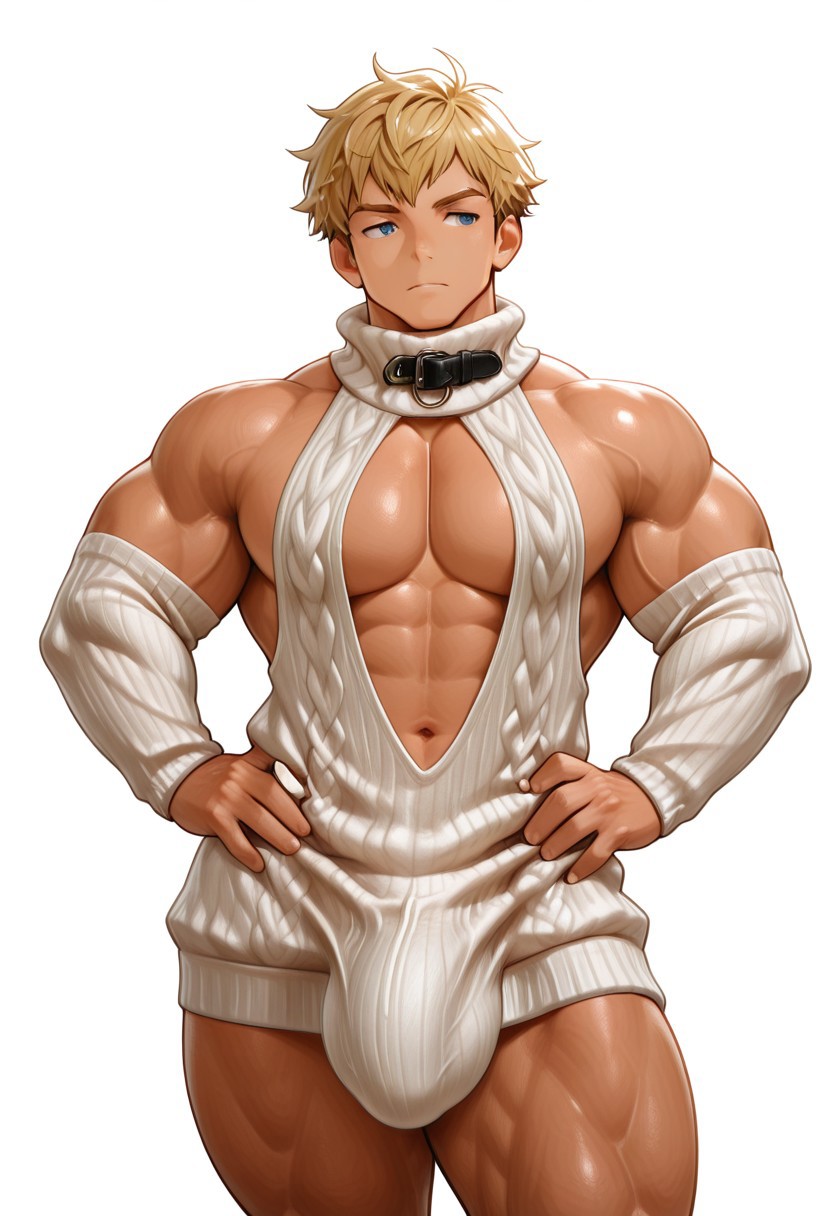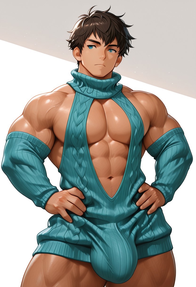 A muscular guy wearing a virgin killer sweater is inviting you. Will you take him up?