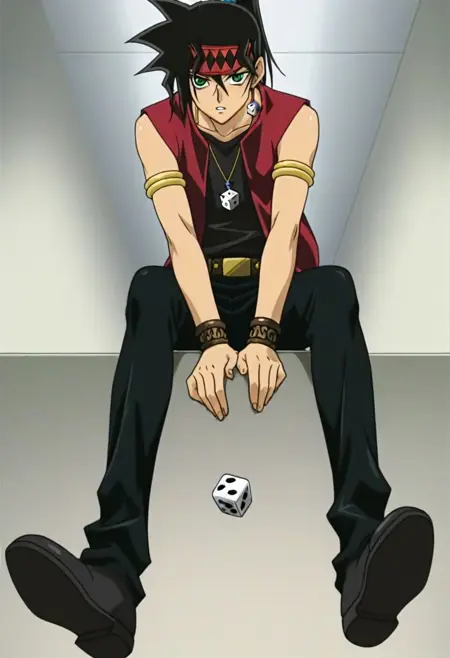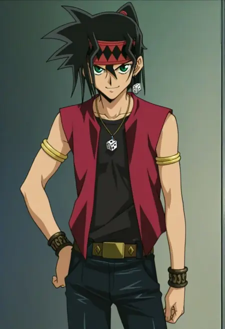 DukeRyuji, black hair, ponytail, headband, green eyes, black mark under eye, single dice earring, sleeveless red open vest, black undershirt, gold armlets, gold bracelets, necklace, belt, dark blue leather pants, black shoes