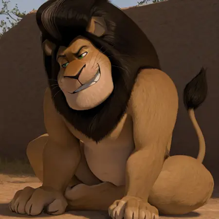 Makunga, solo, furry male, whiskers, green eyes, dark tan fur, black mane with a gray streak in it, lion ears, lion tail, claws, paws,