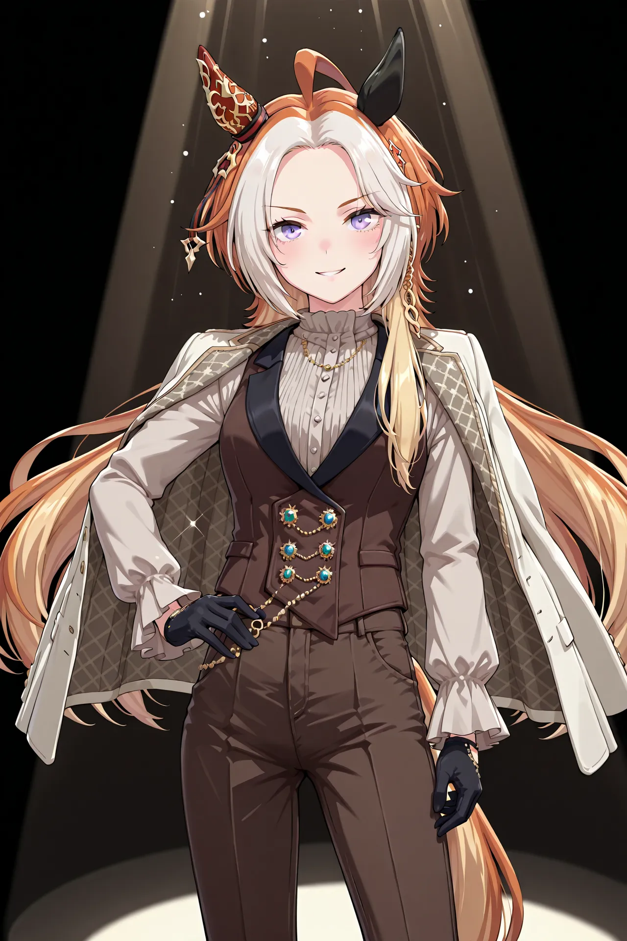 horse ears,animal ears,horse girl,multicolored hair,long hair,ahoge,white hair,purple eyes,blue eyes,ear ornament,
