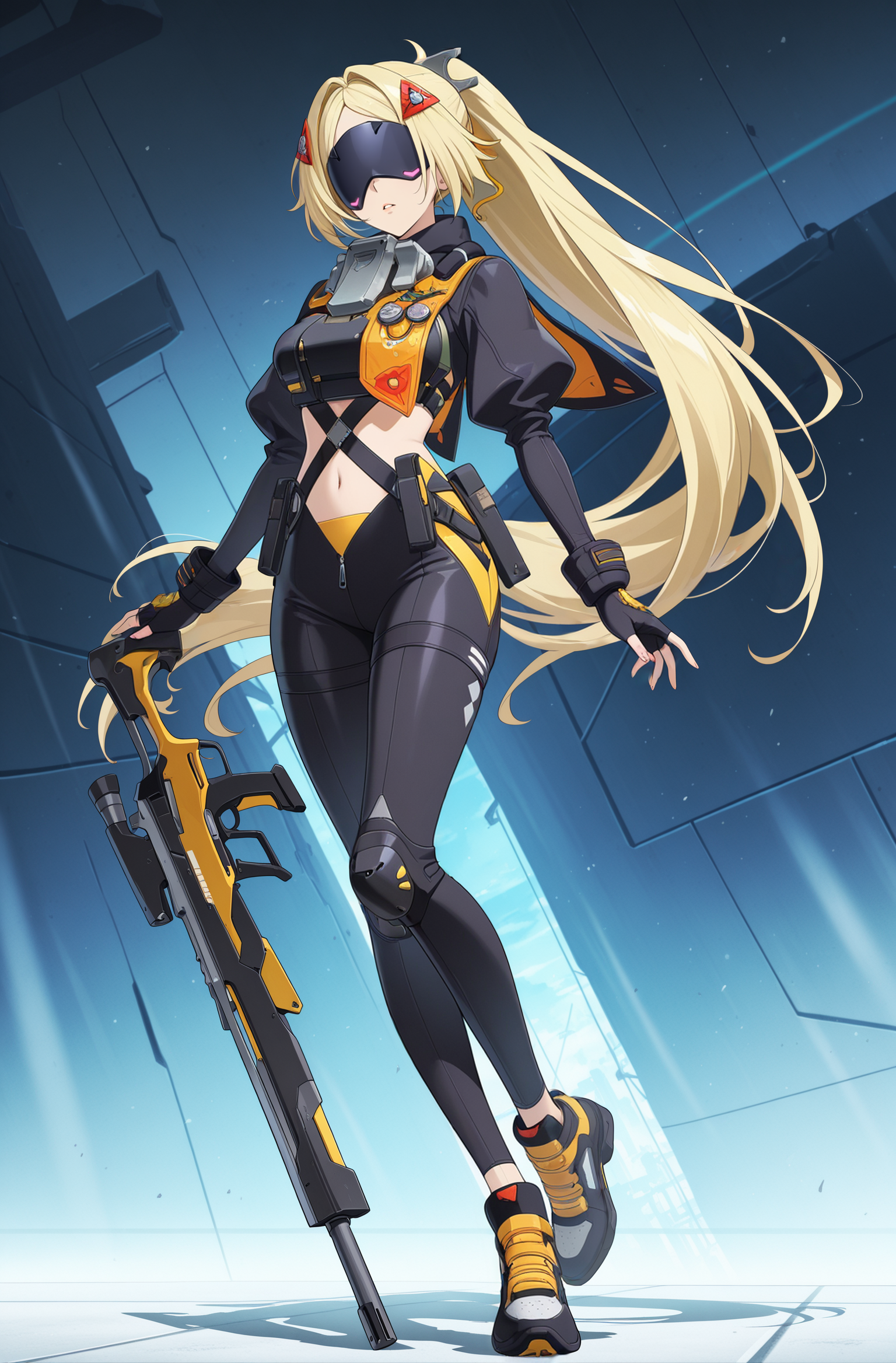- fingerless_gloves, gloves, crop_top, long_sleeves, juliet_sleeves, puffy_sleeves, midriff, navel, pants, black_pants, leggings, shoes, zipper_pull_tab
