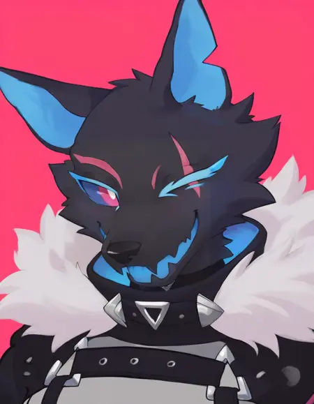• Use "wolf, clothing, one eye closed, fur trim \(clothing\), scar, pink scar, blue sclera, pink eyes" for better results
