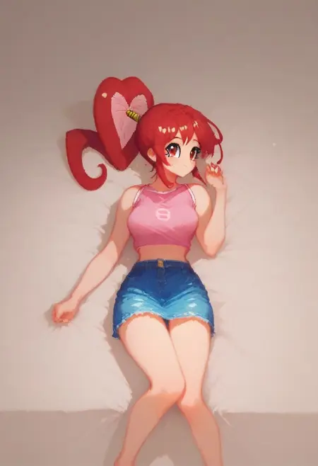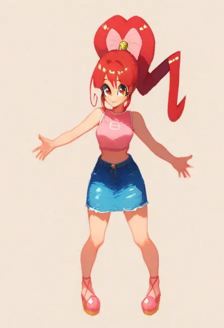 red hair, haato ponytail, yellow t1ghtb0w, red eyes, sleeveless shirt,pink sleeveless shirt, crop top, denim skirt, wedge, pink wedge,