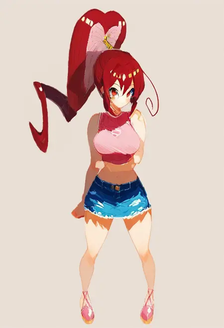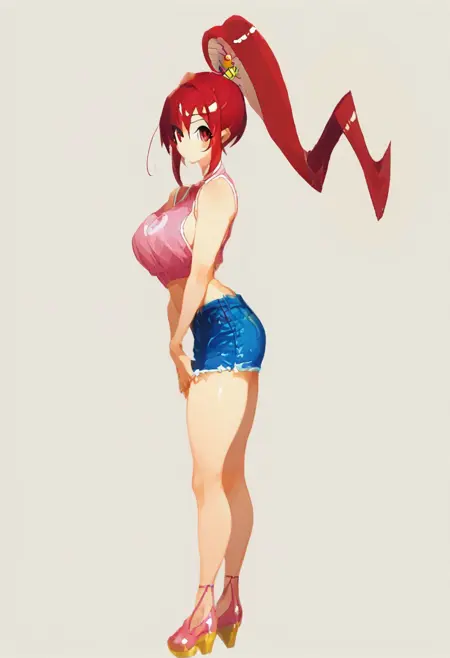 red hair, haato ponytail, yellow t1ghtb0w, red eyes, sleeveless shirt,pink sleeveless shirt, crop top, denim skirt, wedge, pink wedge,