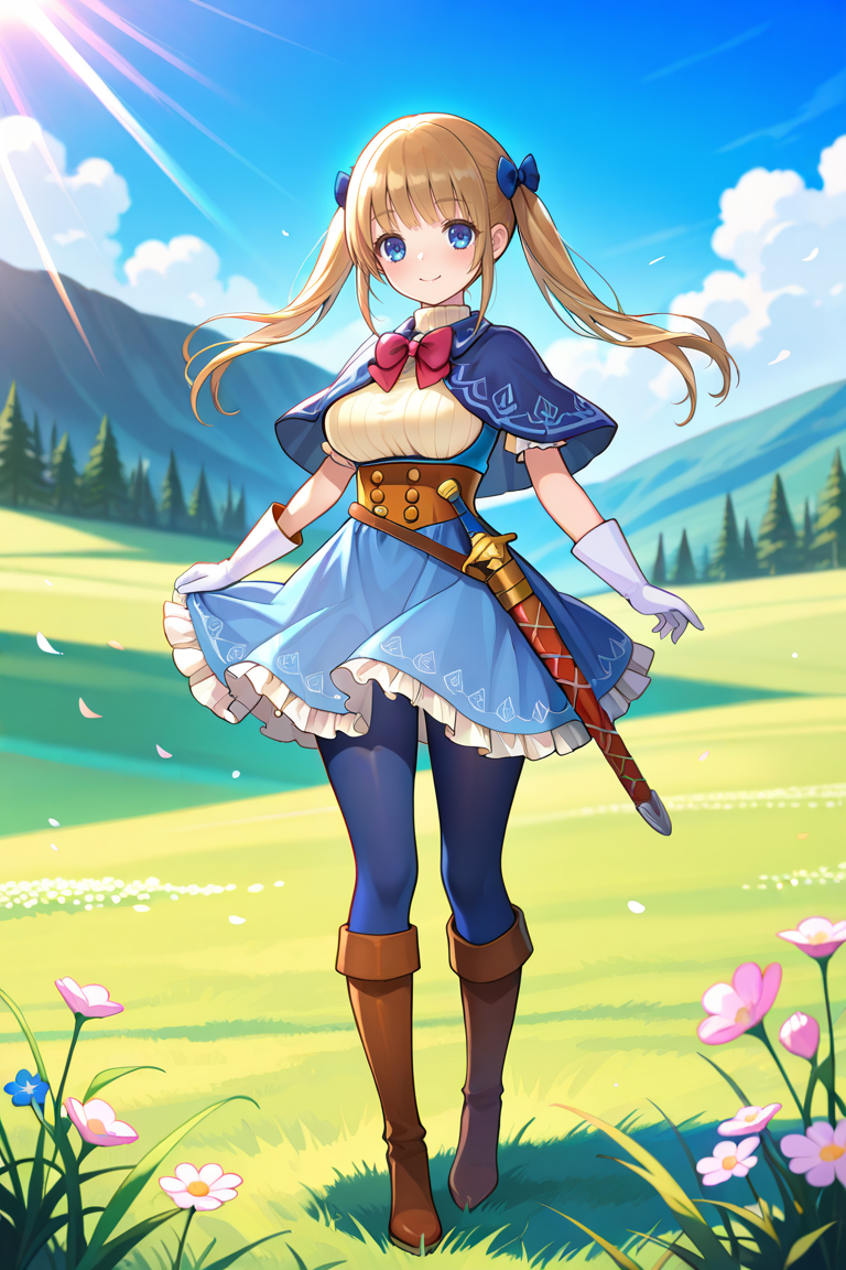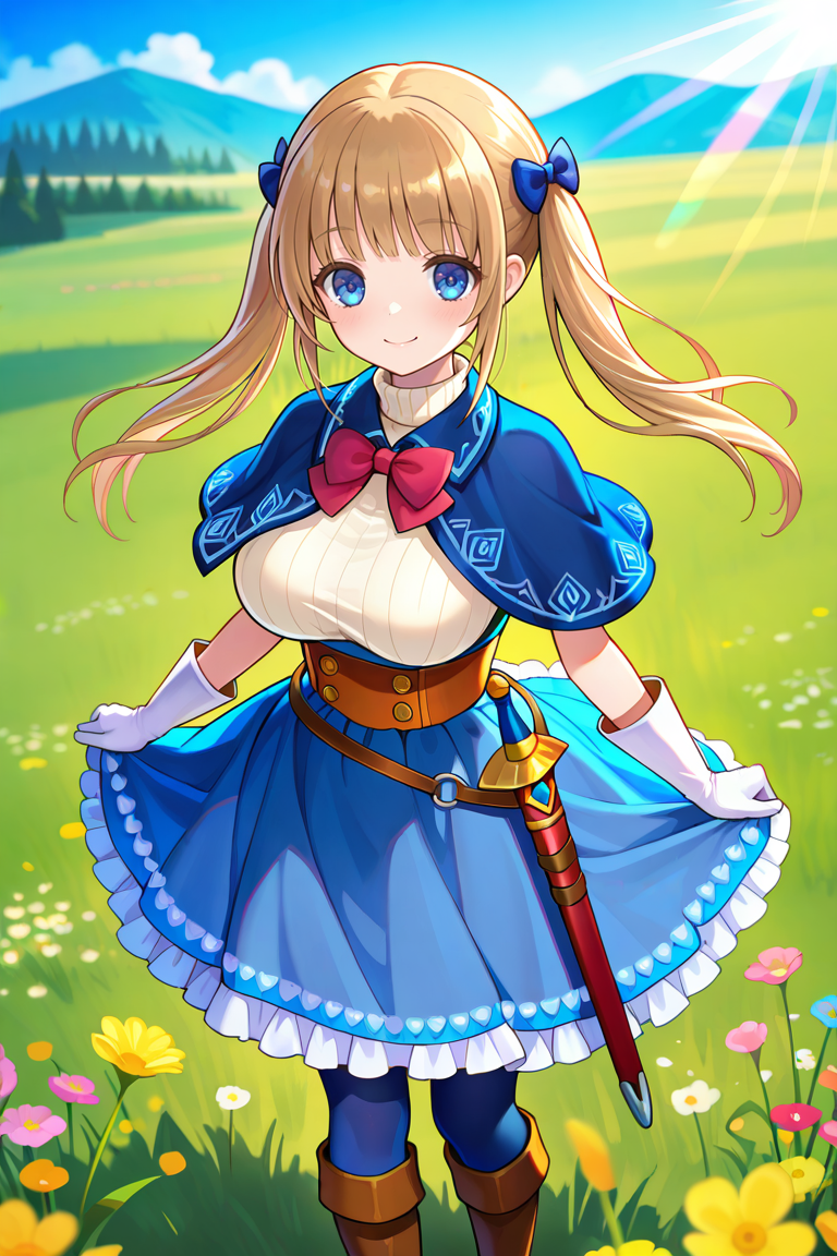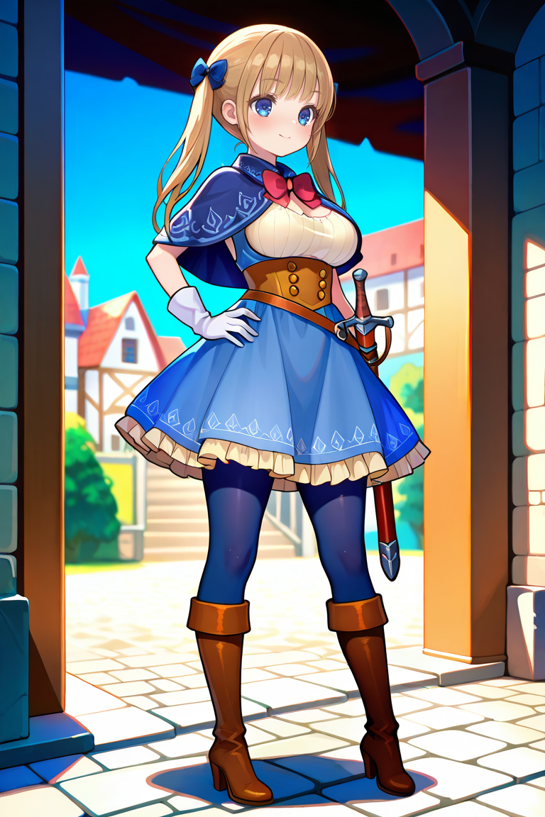 chevalier_cloth,white gloves, blue capelet,belt,sheath, red bowtie, turtleneck, underbust, white shirt, high-waist skirt, frilled skirt, blue skirt, blue pantyhose, knee boots, high heel boots,brown footwear