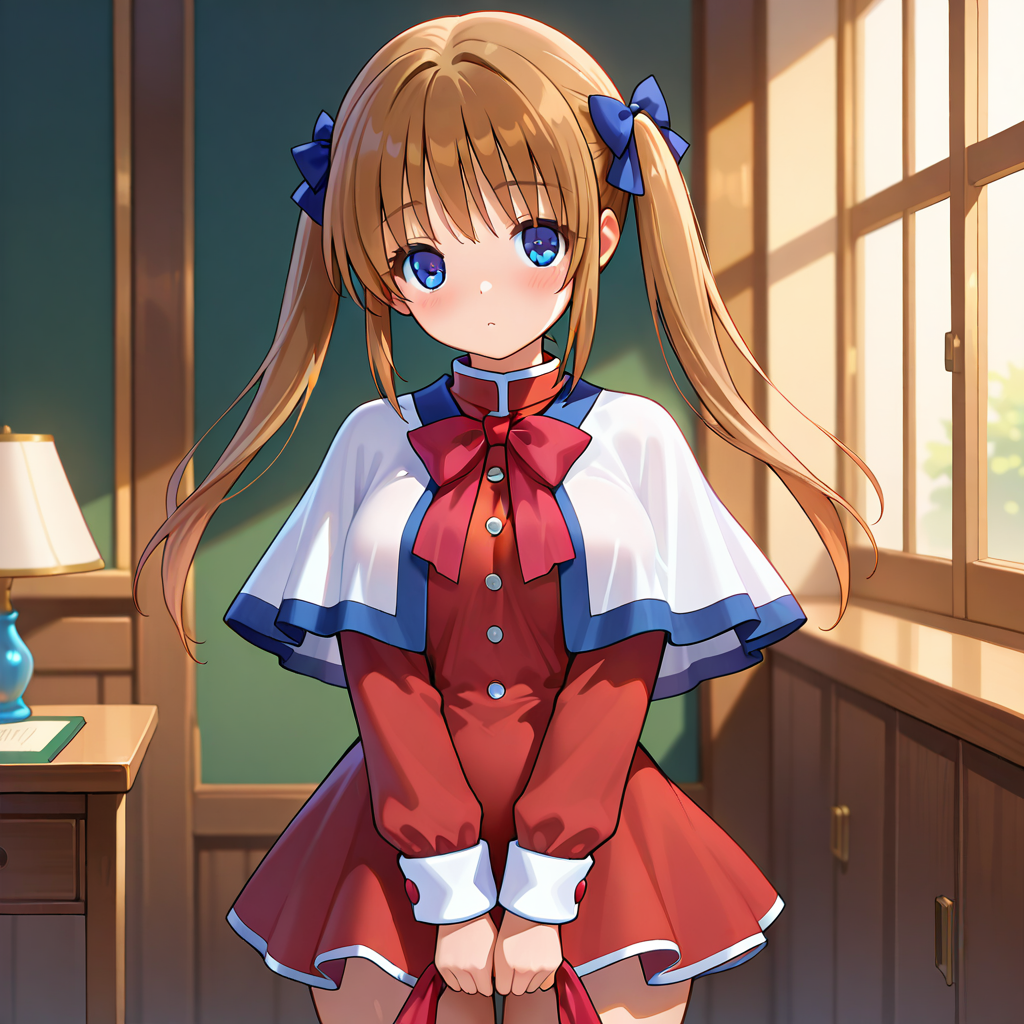 chevalier_face,brown hair,twintails,blue eyes,long hair, hair bow