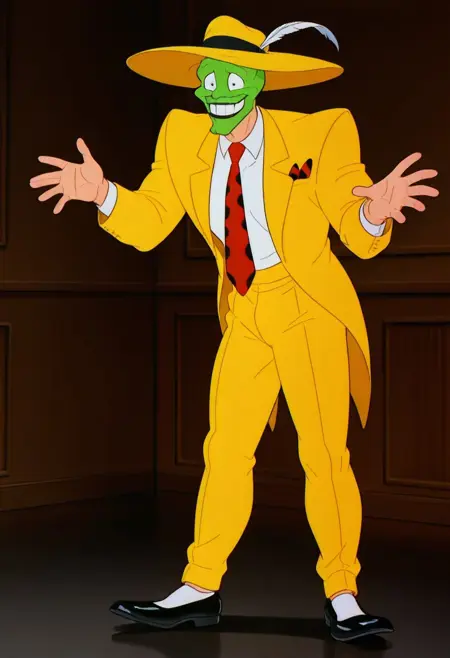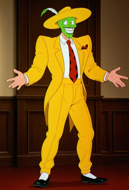 Prompt: The Mask Stanley, solo, 1boy, green face, green head, bald, normal color neck, yellowhat with a feather, yellow suit, white shirt, red tie with black dots, red handkerchief with black dots, yellow pants, black shoes