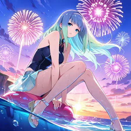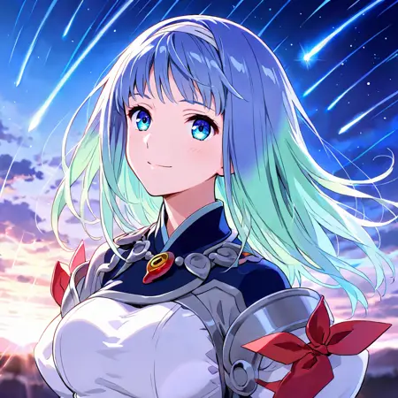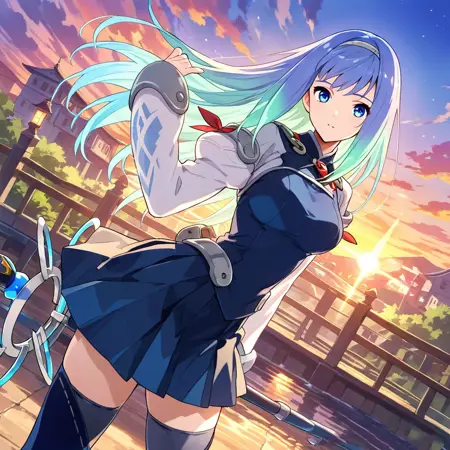 基本トリガーテキスト:1girl TeeKee、青い髪、長い髪、グラデーション髪、ヘアバンド、青い目、青いセーラー襟、長袖、青いスカート、ブーツの下の太ももハイ