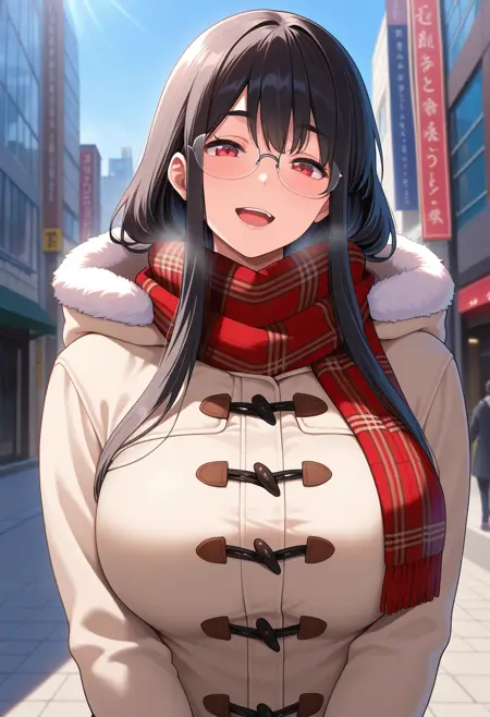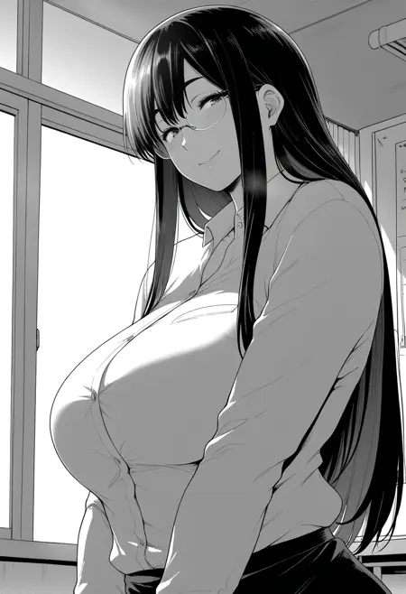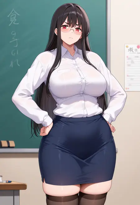- shiraseww, mature female, red eyes, black hair, long hair, sidelocks, large breasts, glasses, rimless eyewear,