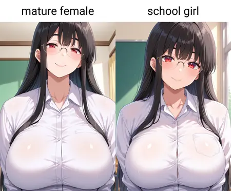 (For example, replacing "mature female" with "school girl" – though please note that "school girl" may trigger moderation on CivitAI, so simply omitting "mature female" might be a safer alternative.)