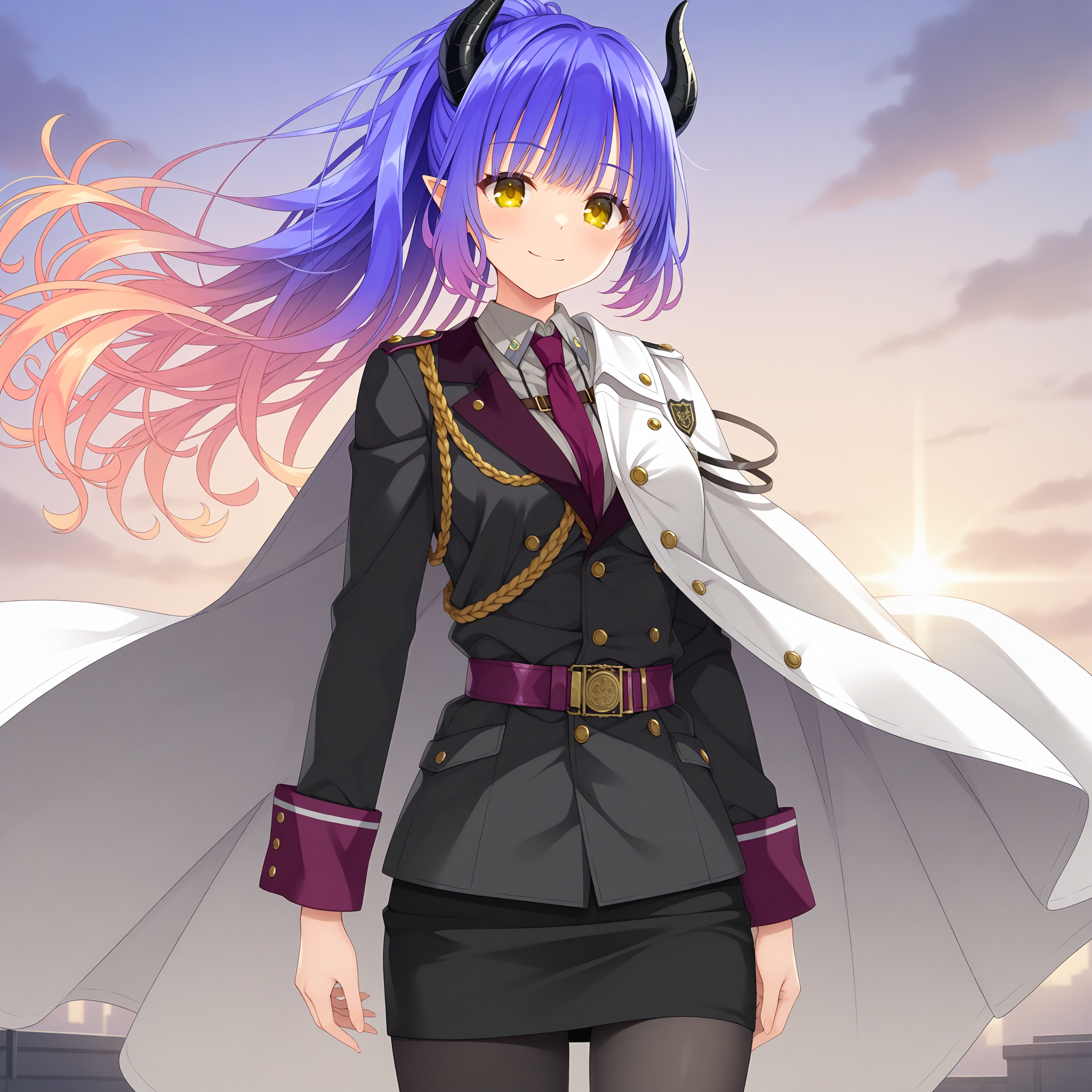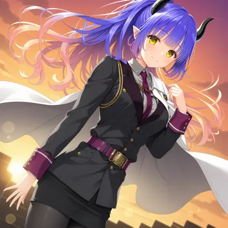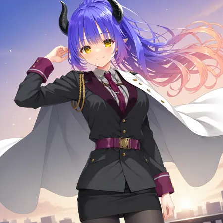 high ponytail,demon horns,pointy ears,black skirt,pencil skirt,black jacket,long sleeves,black pantyhose,miniskirt,purple cuffs,purple necktie,purple belt,gold buckle,belt buckle,collared shirt,grey shirt,buttons,white cape,collared cape,
