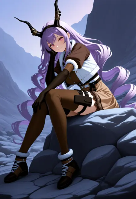 Typh0nPthfndr, pink eyes, purple hair, very long hair, drill hair, black hairband, horns, brown shirt, brown skirt, white jacket, cropped jacket, fur-trim, brown sleeves, elbow gloves, black gloves, thigh holster
