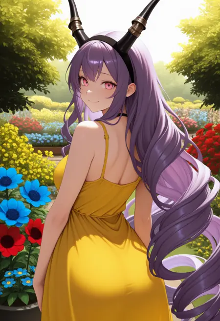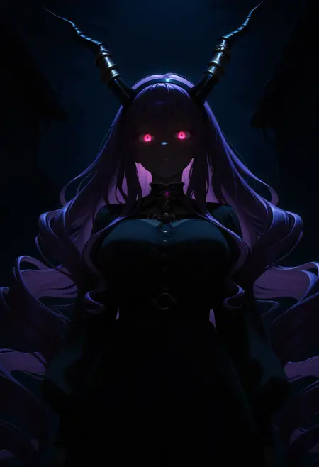 Typh0n, pink eyes, purple hair, very long hair, drill hair, hairband, horns