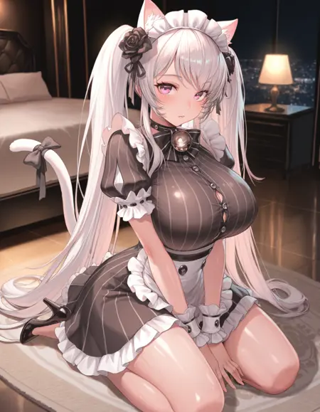 cat tail, tail ribbon, maid headdress, wrist cuffs, arm cuffs, frills