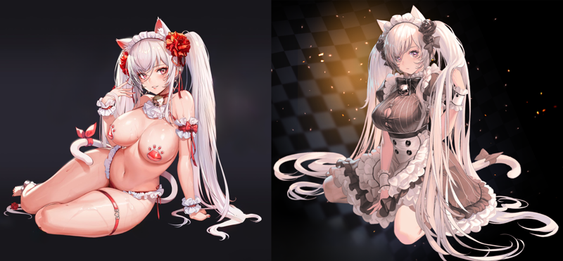 Her normal appearance has pink/red eyes, maid has a light purple.