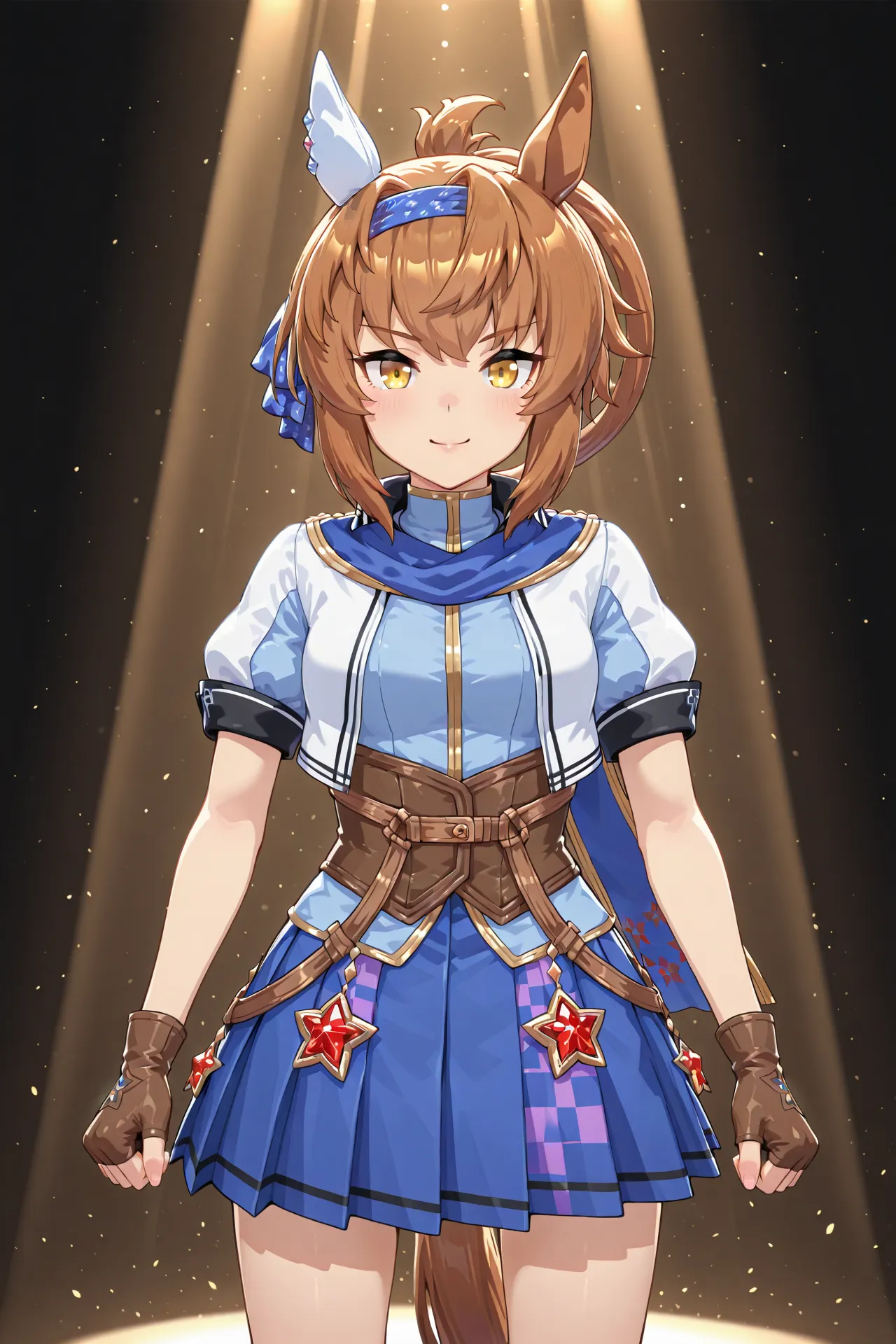 animal ears,horse ears,horse girl,brown hair,yellow eyes,horse tail,hairband,single ear cover,