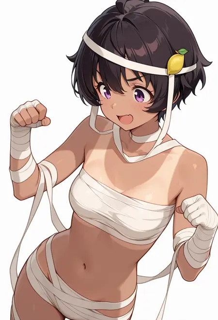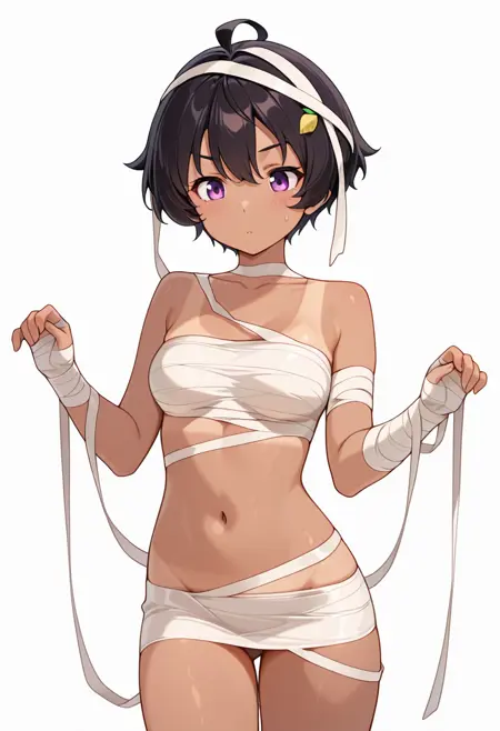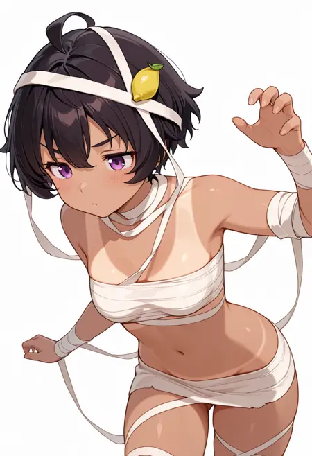 lemon_s2, mummy costume, chest sarashi, tanlines, navel, bandages, naked bandage, bandaged arm,
