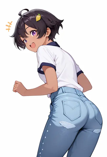 lemon_cnr, 1girl, short hair, black hair, purple eyes,dark-skinned female, ahoge,hair ornament,