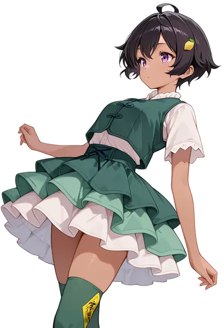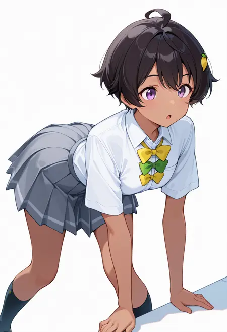 lemon_cnr, 1girl, short hair, black hair, purple eyes, dark-skinned female, ahoge, hair ornament,