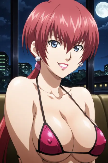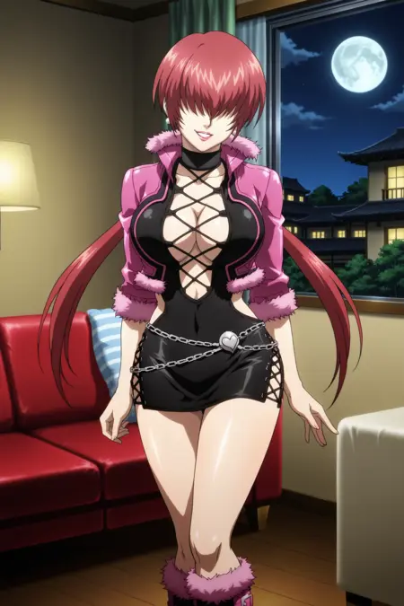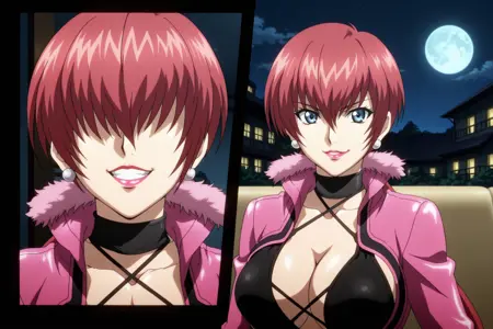 fatal_fury_city_of_the_wolves_promo_style, fatal_fury_city_of_the_wolves_promo_for_shermie, 红发, 发丝遮眼, 长发, 分叉马尾, 口红, 耳环, 大胸, 锁骨, 深V, 微笑, 夹克, 连衣裙, 超短裙, 过膝靴