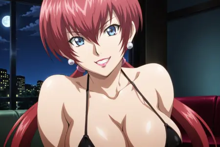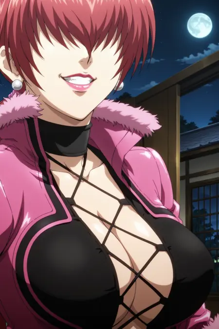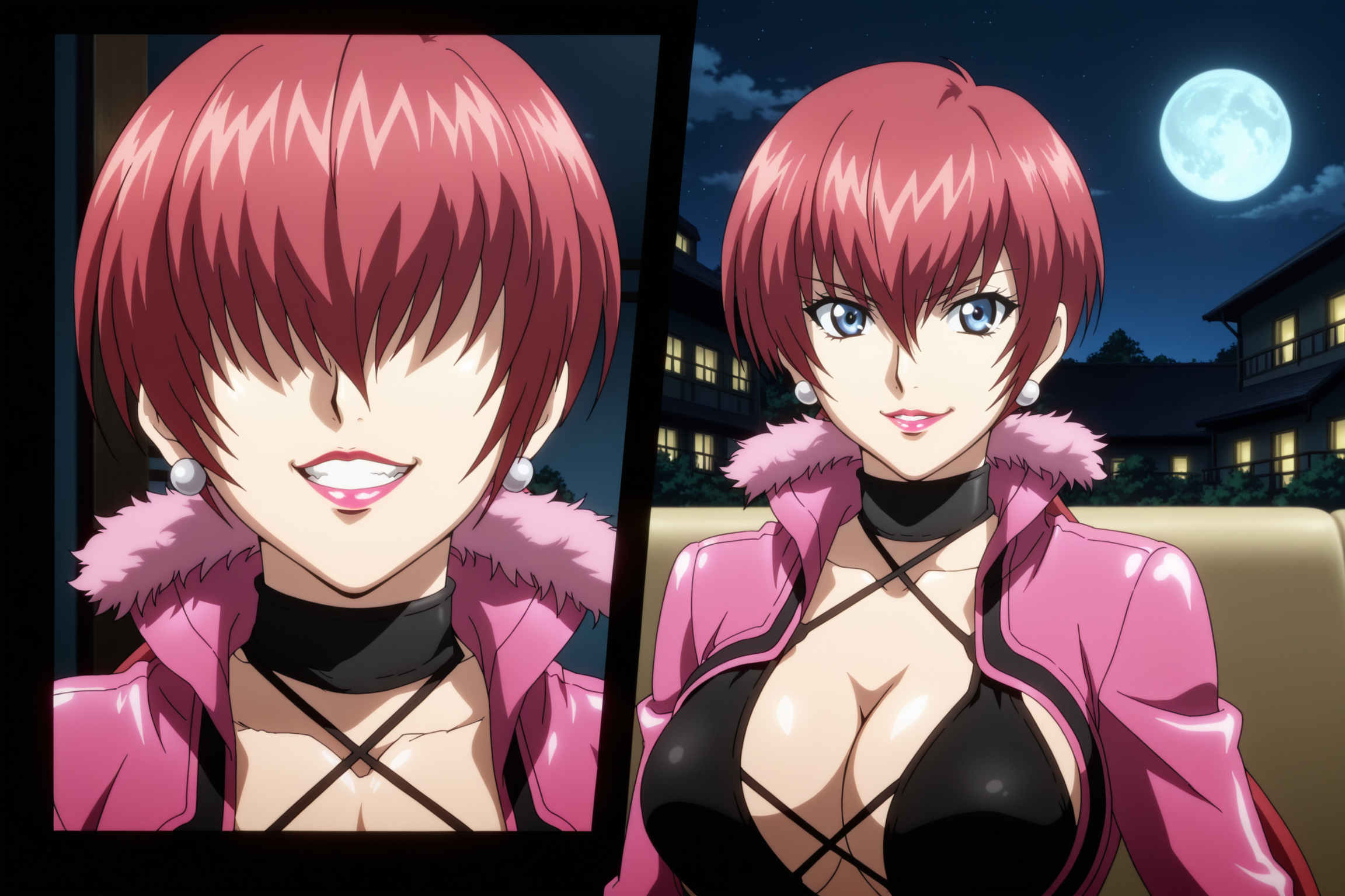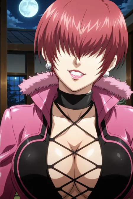 fatal_fury_city_of_the_wolves_promo_style, fatal_fury_city_of_the_wolves_promo_for_shermie, red hair, hair over eyes, long hair, split ponytail, lipstick, earrings, large breasts, collarbone, cleavage, grin, jacket, dress, miniskirt, knee boots