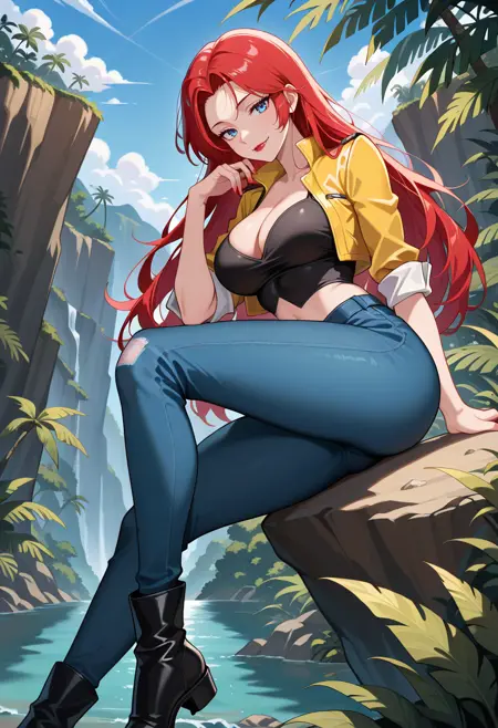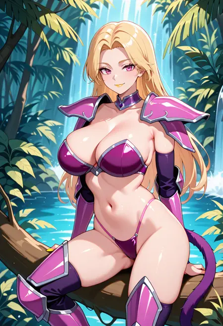 Outfit: gold choker, metal choker, gold pauldrons, blue shoulder armor, strapless bikini top, metal bikini top, gold bikini top, blue thong, metal thong, gold thong trim, gold elbow armor, gold knee armor, blue shin guards, gold heels, metal heels, cat tail, gold tail