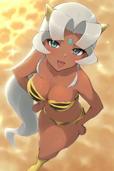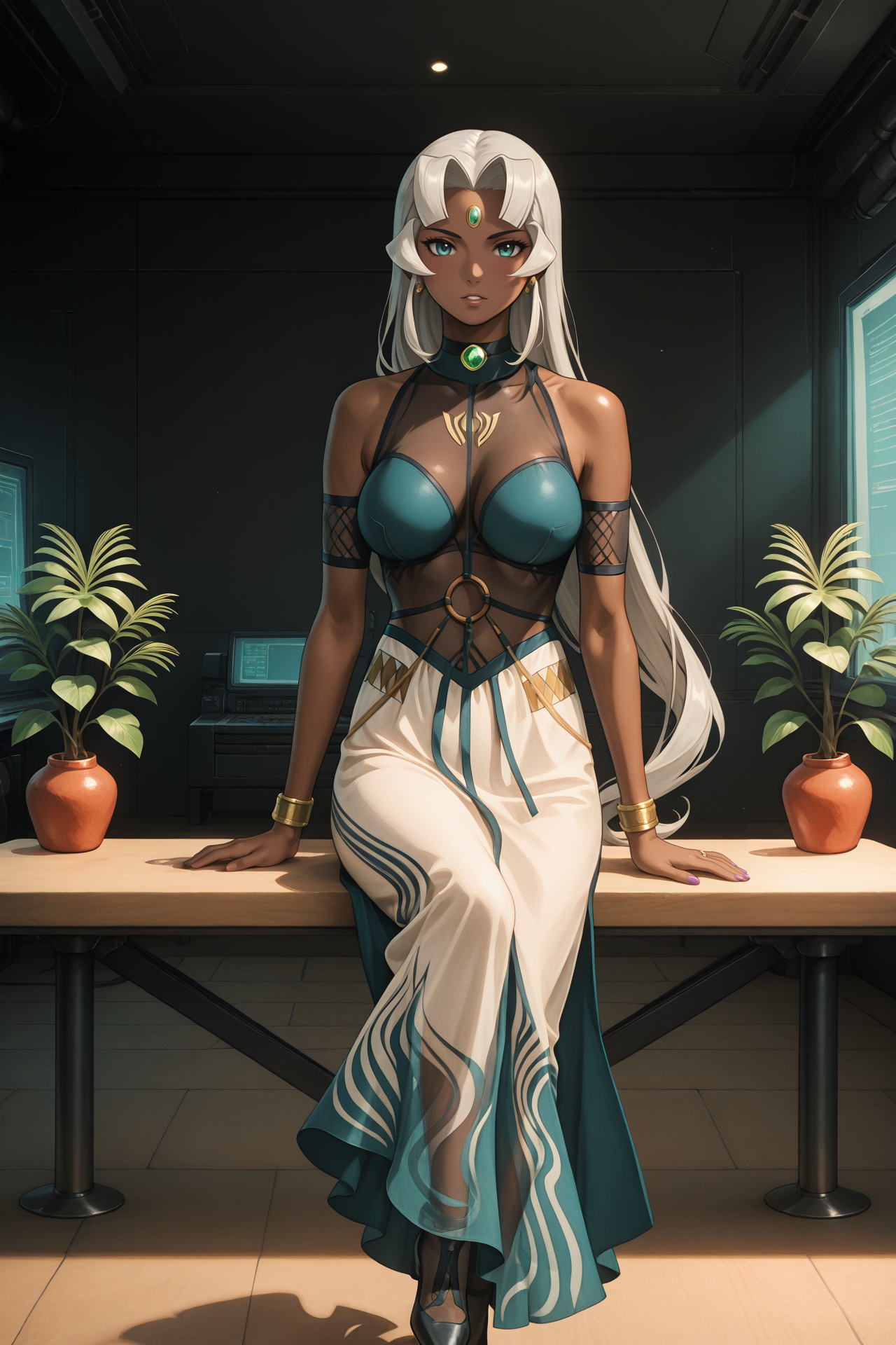 Main prompt: Buzam_Calessa, dark skin, dark-skinned female, long grey hair, grey eyes, makeup, purple lips, shiny skin, jewelry, forehead jewel, large breasts