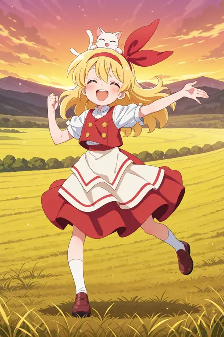 hair ribbon, red ribbon, red hairband, red vest, buttons, white shirt, short sleeves, red skirt, white aporn, waist apron,