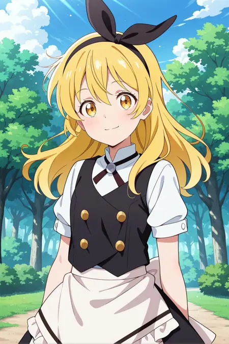 ellen, 1girl, solo, yellow eyes, blonde hair, long hair, hair ribbon, black ribbon, black hairband, black vest, buttons, white shirt, short sleeves, black skirt, white aporn, waist apron,