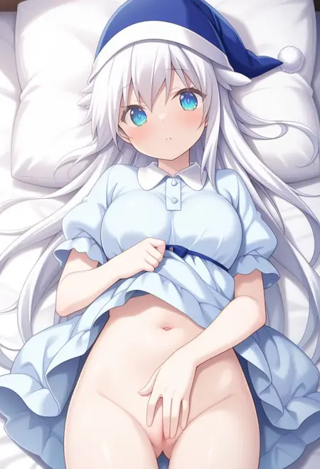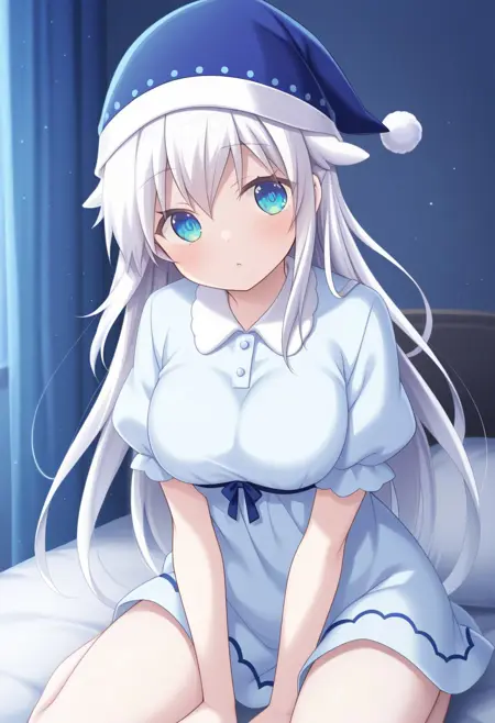 1 girl, amayuifia, white hair, long hair, blue eyes, blue hat, blue nightcap, blue pajamas, puffy short sleeves, blue dress