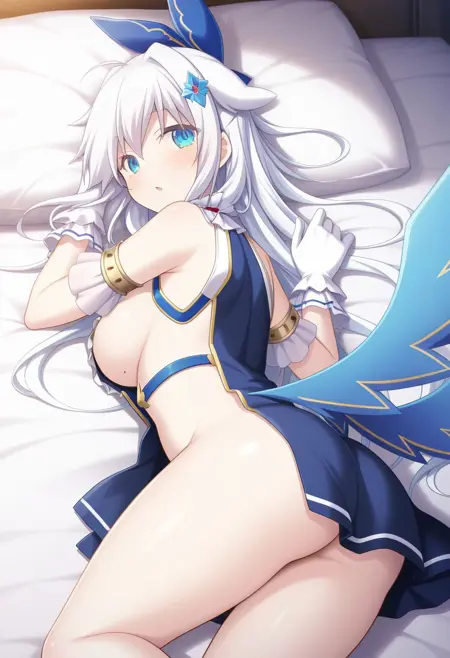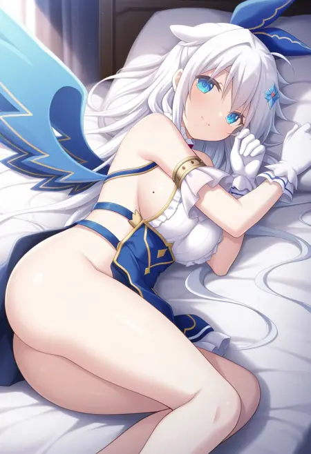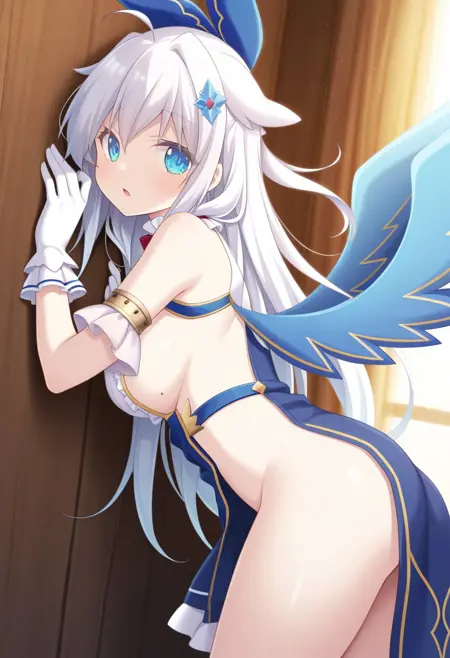 1 girl, amayuifia, white hair, long hair, blue eyes, blue hair ribbon, hair ornament, fiaACM hair ornament, frilled collar, collared dress, red bowtie, brooch sideless dress, frilled dress, sideless outfit, fiaACM dress, frilled armlet, gold armlet, fiaACM armlet, white gloves, frilled gloves, blue wings, gold thighlet, legband, high heel sandals, fiaACM sandals