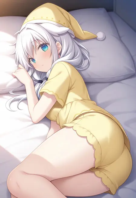 1 girl, amayuifia, white hair, long hair, hair over shoulder, hair tie, hair ribbon, blue ribbon, yellow nightcap, yellow pajamas, yellow shirt, short sleeves, yellow shorts