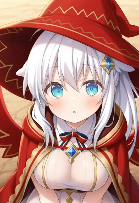 1 girl, amayuifia, white hair, long hair, ponytail, hair tie, blue eyes, red and blue hair ribbon, fiaalm hair ribbon, hair ornament, red robe, red and blue bowtie, white and gold dress, collared dress, fiaalm dress, see-through clothes, see-through dress, red wings, gold thighlet, legband, black shoes