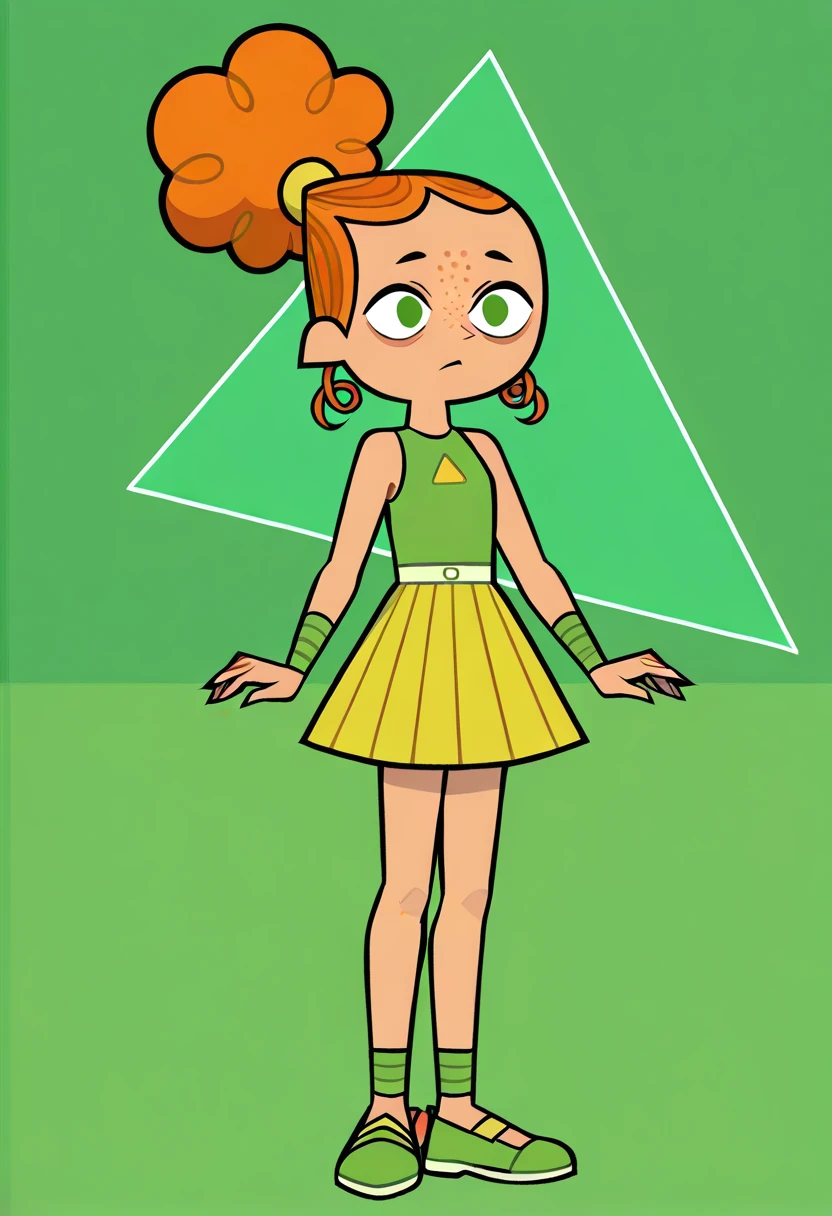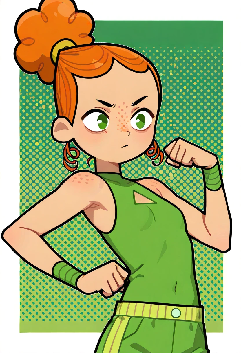 IzzyTDR, 1girl, curly orange hair, hair styled in a bun, green eyes, green top with a triangle cutout, light green, green shoes, green wristbands, freckles, short, chibi