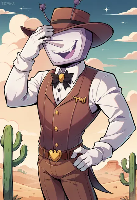 Tenna_(Deltarune), object head, antennae, pointy nose, no eyes, alternate costume, cowboy, hat, white shirt, collared shirt, long sleeves, sleeveless vest, black ribbon, emblem, white gloves, brown belt, brown pants