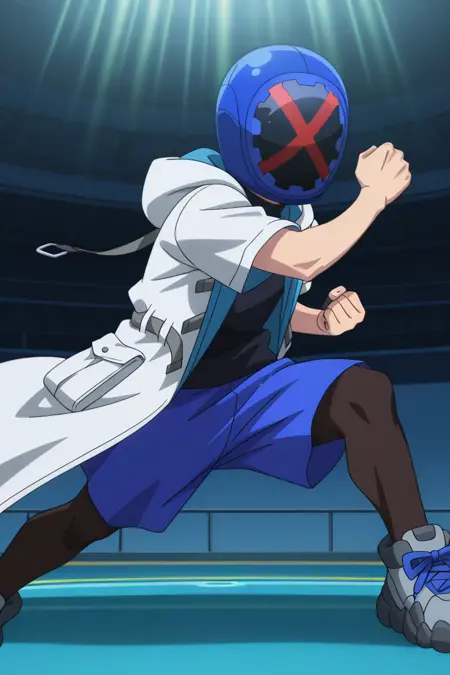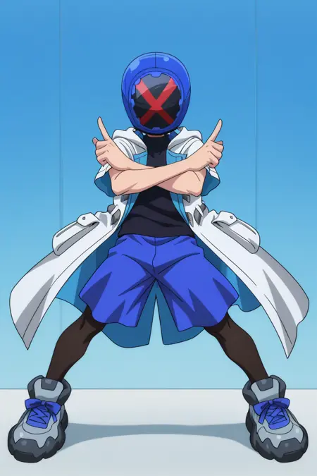 Main outfit: short sleeves, white hooded trench coat, black turtleneck t-shirt, blue shorts, black leggings, grey sneakers, blue shoelaces,