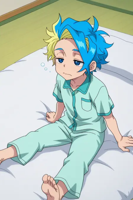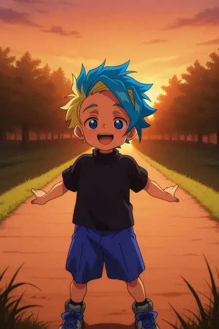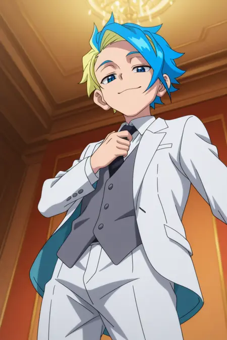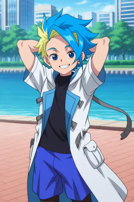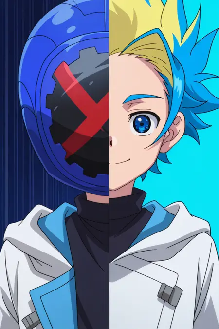 Base: bbx-ekusu, spiked hair, two-tone hair, blue hair, blonde hair hair, yellow hairband, blue eyes,