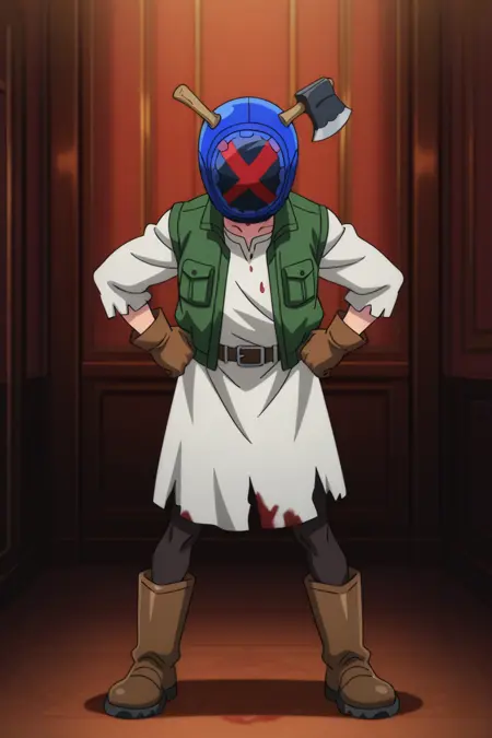 Helmet: blue helmet, covered face,