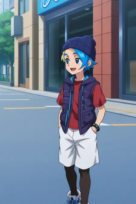 Beyblade Park outfit: dark blue beanie, short sleeves, red t-shirt, dark purple down vest, bracelet, white shorts, black leggings, white and blue sneakers,
