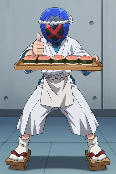 Sushi chef outfit: japanese clothes, white kimono, white waist apron, white pants, white tabi socks, geta,