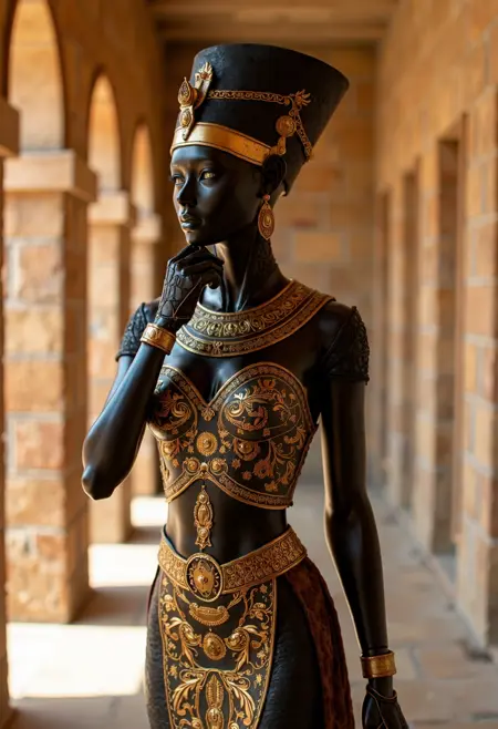 Prompt: robot mummy walking in desert, black beige gold, background pyramid, night, starry sky