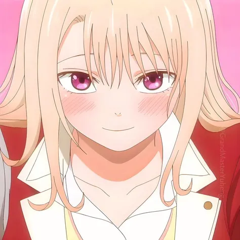 Appearance: school uniform, green skirt, sweater vest, pink vest, blonde hair, pink eyes