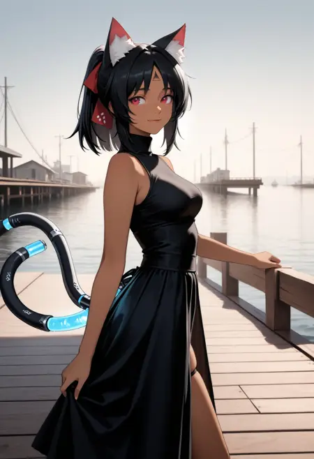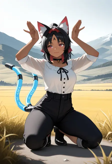 (正向提示词)znekomiya, 猫娘, 猫耳, 双尾, 中等胸部, 动物耳朵绒毛, 深色皮肤, 机械尾巴, 中长发, 红色眼睛, 额头标记, 高马尾, 黑发,