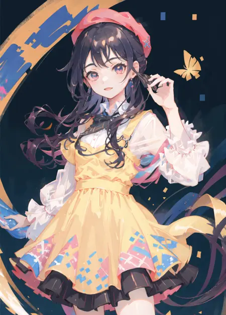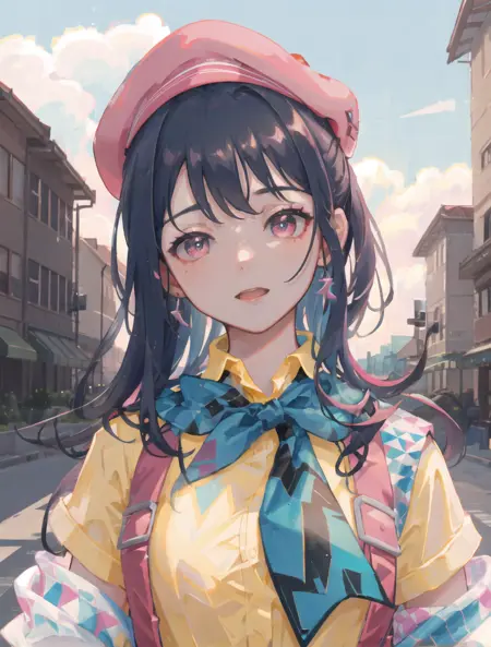 구 이미지(정확히 일치는 보장되지 않음): 베렛, 노란 셔츠, 분홍 치마, 빨간 눈, 네크타이, 머리 장식, 매우 긴 머리카락, 낮은 두 낌새 머리, 보라색 눈, 앞머리, 손목 끈
