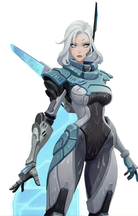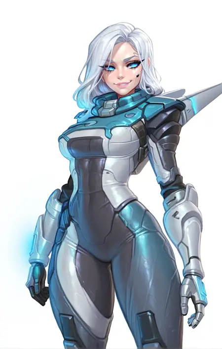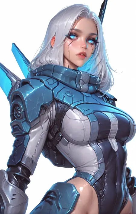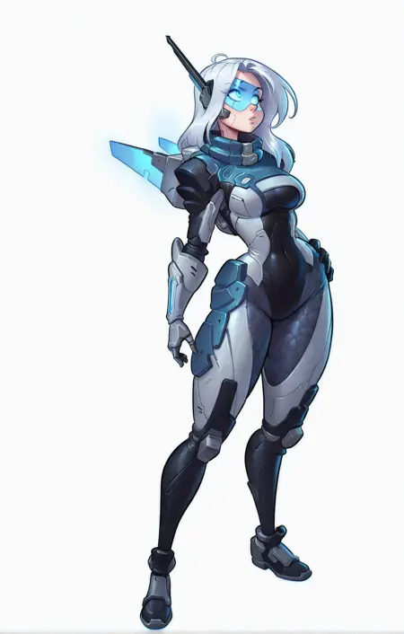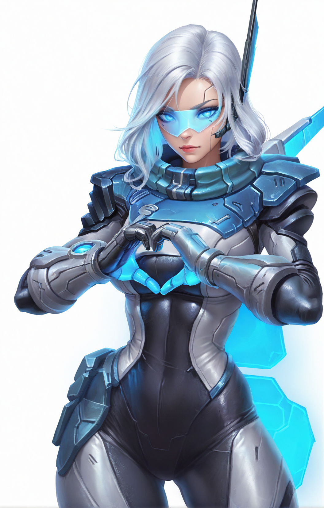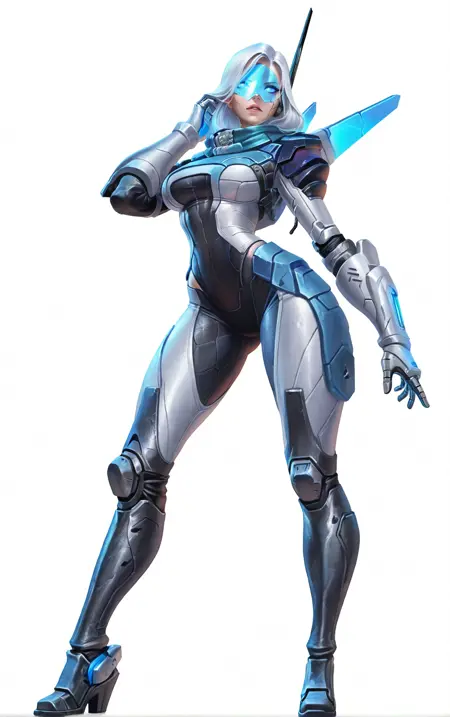 Project_Ashe, white hair, long hair, straight hair, glowing blue eyes, athletic body, slim, cyberpunk visor, futuristic armor, techwear, bodysuit, armored gloves, thigh-high boots, mechanical details, sci-fi accessories, blue trim