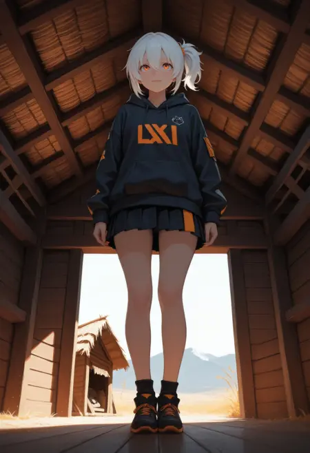(正向提示词)zsoldier11, hair between eyes, orange eyes, short ponytail, white hair, short hair, side ponytail, ponytail,