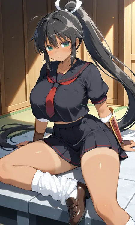 Homura (Senran Kagura), very long hair, black hair, green eyes, hair ribbon, ponytail, large breasts, thighs, ((Tanned-Skin)), hebijo_outfit, black serafuku, loafers, loose socks, black skirt, pleated skirt, short sleeves