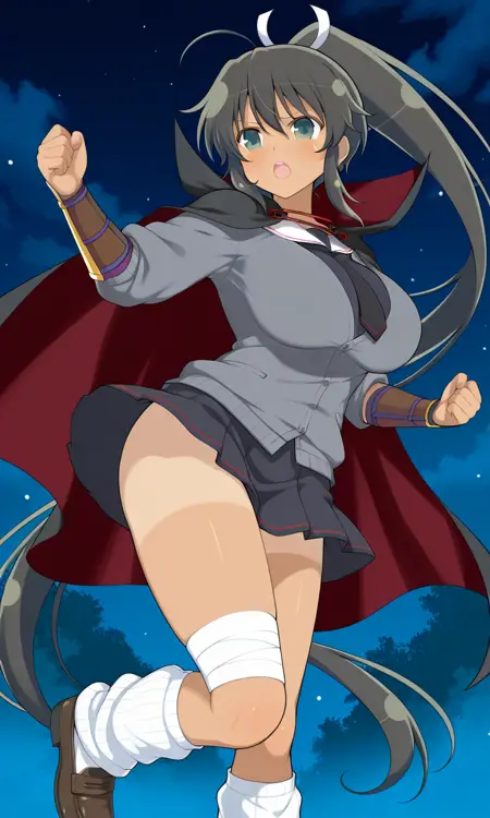 Homura (Senran Kagura), very long hair, black hair, green eyes, hair ribbon, ponytail, large breasts, thighs, ((Tanned-Skin)), homura_shinobi_outfit, ((short black dress)), (gray cardigan:1.2), black cape, bandages, white sailor collar, loose socks, black dress, arm guards, black skirt, loafers