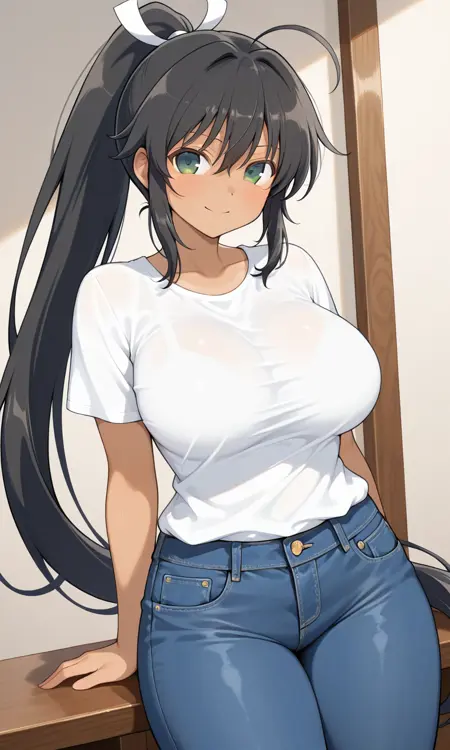 Homura (Senran Kagura), very long hair, black hair, green eyes, hair ribbon, ponytail, large breasts, thighs, ((Tanned-Skin)), homura_casual_clothes, jeans, white shirt