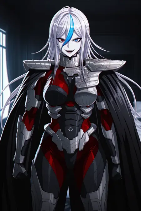V'ehxness, long hair, blue eyes, red eyes, heterochromia, hair between eyes, blue hair, white hair, grey hair, two-tone hair, streaked hair, multicolored hair, cape, armor, shoulder armor, pale skin, white skin, pauldrons, black cape